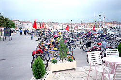 | Diesmal hatten die Veranstalter einen Platz im Hafen als Parkfläche für die Radler abgesperrt. Wo bekommt man so etwas noch geboten, Parkplatz direkt im Centrum am Hafen, die nächsten Restaurants nur wenige Meter entfernt und wer sich Zeit nahm Rovinj zu erkunden, den erwartete fantastisches. So z.B. auf der Spitze der Halbinsel die mächtige Domkirche Sv. Eufemja, die ab 1736 anstelle von zwei älteren Kirchbauten entstanden ist. Überragt wird die dreischiffige Barockkirche von ihrem schlanken, 60 m hohen Campanile, der höchste in Istrien, mit der Statue der hl.Euphemia an der Spitze. Vorbild für diesen Glockenturm war, wie könnte es anders sein, der Glockenturm von Venedig. Und das allerwichtigste an diesem Glockenturm, hat man die vielen maroden Stufen und die Angst davor erst einmal überwunden, bietet sich einem ein phantastsicher Ausblick über Rovinj. | |