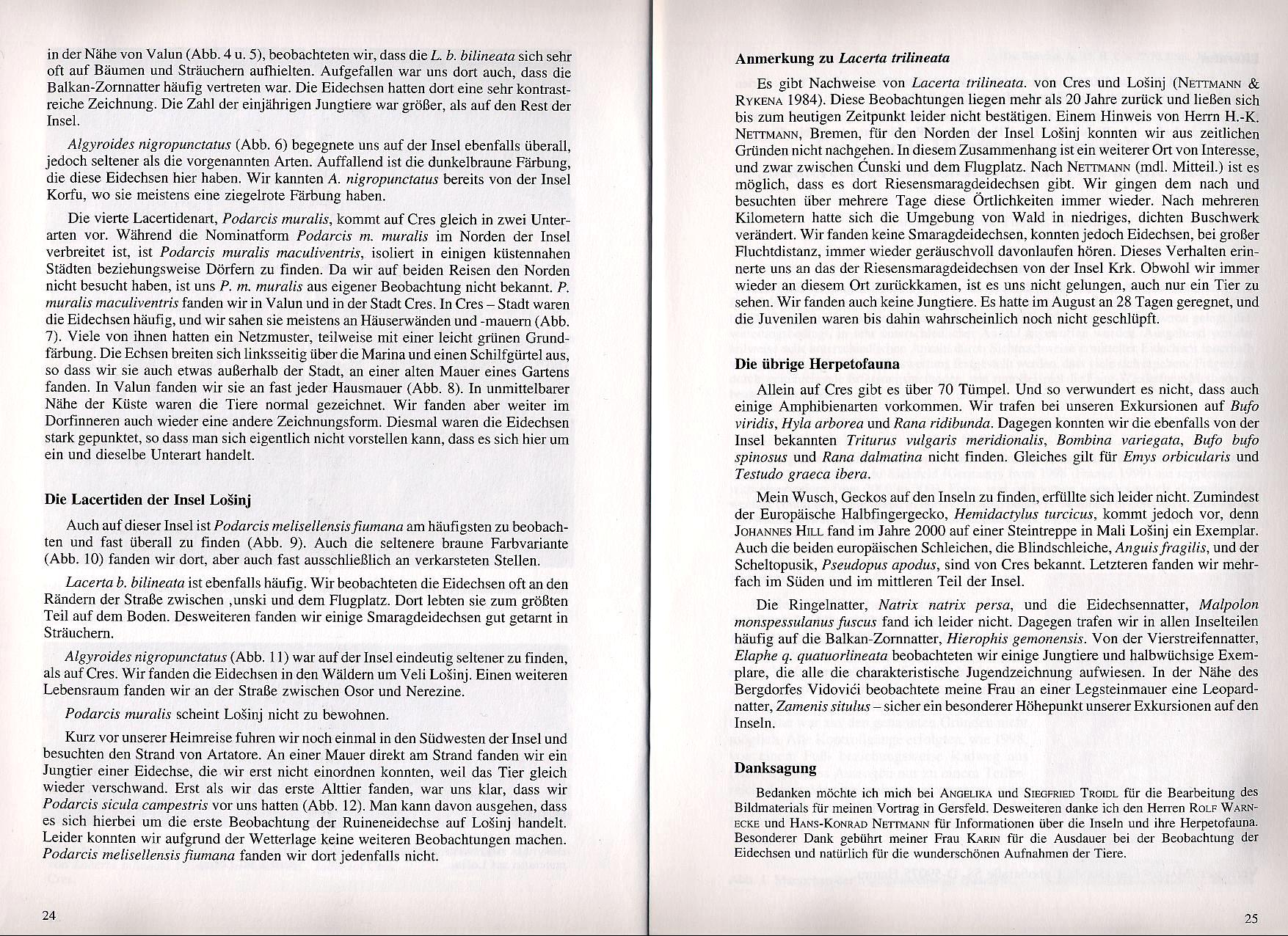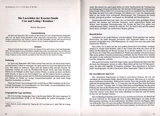 In Heft 1/2004 der Eidechse findet sich auf den Seiten 20-26 ein Beitrag von Martin Dieckmann mit dem Titel "Die Lacertiden der Kvarner Inseln Cres und Losinj / Kroatien". Der Artikel widmet sich in einer wissenschaftlichen Betrachtungsweise den Eidechsenvorkommen auf Cres und Losinj. Dabei werden sowohl Vorkommen als auch Aussehen (Färbung und Zeichnung) und Verhalten der Tiere beschrieben und analysiert. Auf den Seiten 22-23 finden sich Bilder der beobachteten Eidechsen mit entsprechender Beschreibung. Alle Texte und Bilder des Artikels unterliegen dem Urheberrecht des Autors Martin Dieckmann |